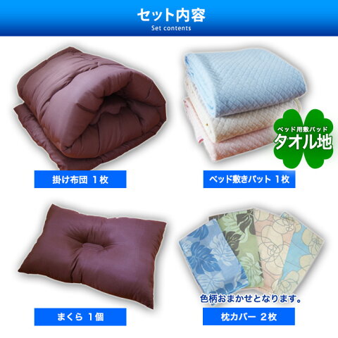 サイズ 掛け布団:150×210cm【ロングサイズ】 まくら:43×63cm 敷パット:100×205cm ピロケース×2枚:43×63cm 素材 【掛け布団/まくら】中綿:中空ポリエステル100% ほこりの出にくい中空綿使用【弾力性抜群】 生地:ソフトブロード ポリエステル100% 優しい肌ざわりのブロード使用 【タオル地敷パッド】表側:パイル部分/綿100%グランド/ポリエステル100% 裏側:ポリエステル80% 綿20% 詰め物:ポリエステル100% 【ピロケース】色柄・素材はおまかせとなります。